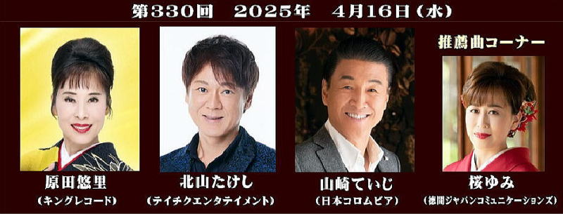 ●第330回大阪発流行歌ライブが2025年4月16日(水)大阪・心斎橋のライブハウス、BIGCATで開かれた。 出演者は、原田悠里(キングレコード)北山たけし(テイチクエンタテイメント)山崎ていじ(日本コロムビア)桜ゆみ(徳間ジャパンコミュニケーションズ)の4人が新曲を披露しました。 続きを読む→大阪発流行歌ライブ・4月ライブ (Music news jp) |