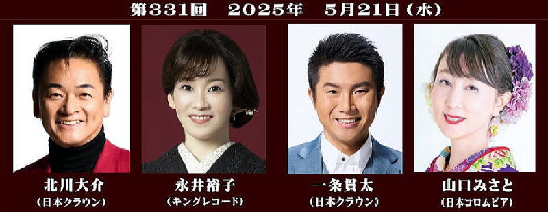 ●北川大介(日本クラウン)永井裕子(キングレコード)一条貫太(日本クラウン) 山口みさと(日本コロムビア)の4人が出演した第331回大阪発流行歌ライブが 2025年 5月21日(水)大阪心斎橋のライブハウスBIGCATで開かれた。 続きを読む→大阪発流行歌ライブ・5月ライブ (Music news jo) |