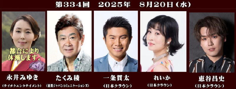 ♦大阪発流行歌ライブが2025年8月20日 大阪・心斎橋のライブハウス、BIGCATで開かれた。たくみ稜(徳間ジャパンコミュニケーションズ)一条貫太(日本クラウン)れいか8同)恵谷昌史(同)の4名が出演した。当初、予定の「永井みゆき」は、同日にリリースした「ゆるし川」を歌唱するはずであったが、先ごろの交通事故に巻き込まれことで頸椎を骨折して出演を見合わせた。永井に変わって、れいかが先月に続いて出演した。 ●続きを読む→大阪発流行歌ライブ・8月ライブ(Music news jp 曽崎重之) |