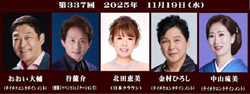 ♦第337回大阪発流行歌ライブが2025年11月20日、大阪・心斎橋のライブハウス、BIGCATで開かれた。 おおい大輔(テイチクエンタテインメント)谷龍介(徳間ジャパンコミュニケーションズ)金村ひろし(テイチクエンタテインメント)北田恵美(日本クラウン)中山琉美(テイチクエンタテイメント)が出演した。 続きを読む➡大阪発流行歌ライブ・11月ライブ(Music news JP 曽崎重之) |