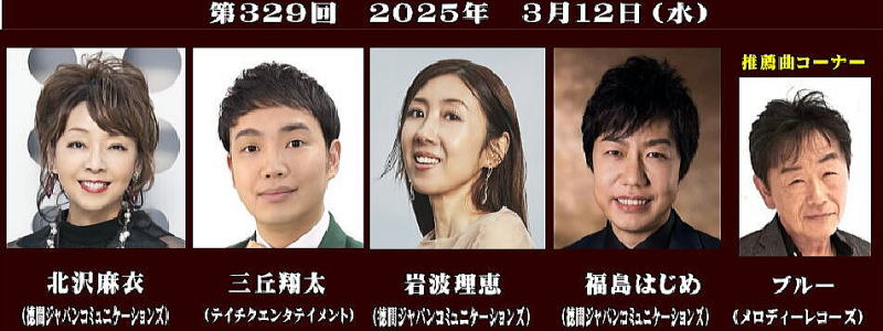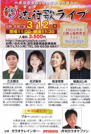 第329回「大阪発流行歌ライブが2025年3月12日 大阪・心斎橋のライブハウス BIGCATで開かれた。 出演者は 、北沢麻衣(徳間ジャパンコミュニケーション)三丘翔太(テイチクエンタテイメント)岩波理恵(徳間ジャパンコミュニケーション)福島はじめ(徳間ジャパンコミュニケーション)ブルー(メロディーレコーズ)の5人が出演しました。 |