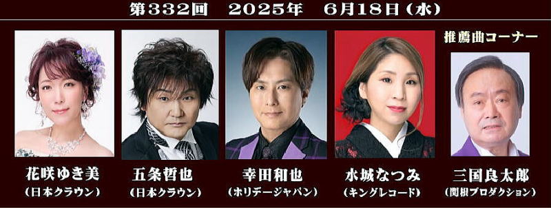 第332回大阪発流行歌ライブ。花咲ゆき美・五条哲也・水城なつみ・幸田和也・三国良太郎が出演 第332開大阪発流行歌ライブが、2025年6月2118日(第三水曜日) 大阪・心斎橋のBIGCATで開かれた。花咲ゆき美(日本クラウン)五条哲也・(同)水城なつみ(キングレコード)幸田和也(ホリデージャパン)三国良太郎(インディーズ)の計5人が出演した。 続きを読む→大阪発流行歌ライブ・6月ライブ(Music news JP・曽崎重之) |