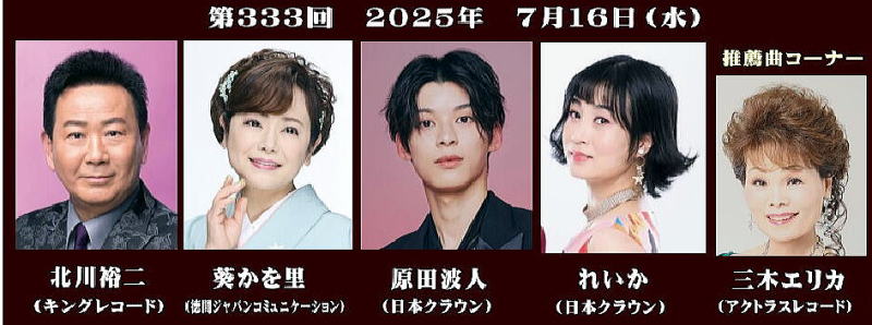 ♦ 大阪発流行歌ライブが2025年7月16日、大阪・心斎橋のライブハウス、BIGCATで開かれた。北川裕二がベテラン演歌歌手の醍醐味を見せると、葵かを里はデビュー20年で大変身を遂げた歌を聴かせた。ジュディ・オング風のコスチュームで2度目の出演した、れいかは今回も杉本真人作品を歌った。デビュー3年目の原田波人は会場の半分を占めるような大勢の応援を受けて、成長した歌唱を披露した。 <すいせん曲コーナー>の三木エリカは巧みな歌唱で美空ひばりの「津軽のふるさと」をカバーした。 続きを読む→大阪発流行歌ライブ・7月ライブ(Music news JP 曽崎重之) |