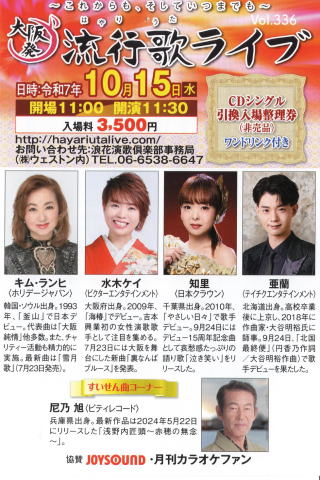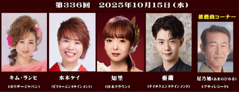 ♦第336回大阪発流行歌ライブが2025年10月15日、大阪・心斎橋のライブハウス、BIGCATで開かれた。 出演したのはキム・ランヒ(ホリデージャパン)水木ケイ(ビクターエンタテインメント)知里(日本クラウン)亜蘭(テイチクエンタテインメント)尼乃旭(プティレコード)の5人 続きを読む➡大阪発流行歌ライブ・10月ライブ(Music news jp 曽崎重之) |
