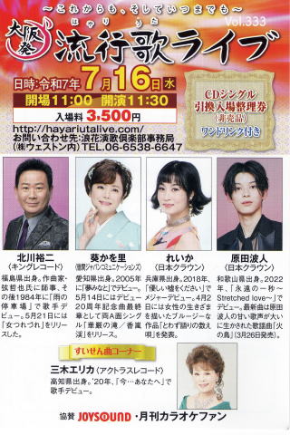 | 資料提供 ;Music news jp 続きを読む→大阪発流行歌ライブ・7月ライブ |