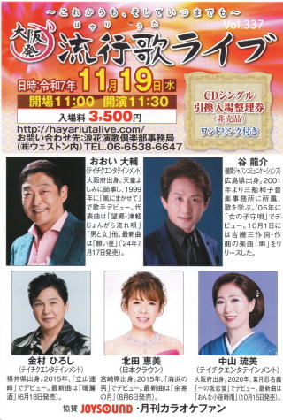| 資料提供:Music news jp 続きを読む➡大阪発流行歌ライブ・11月ライブ(Music news JP 曽崎重之) |